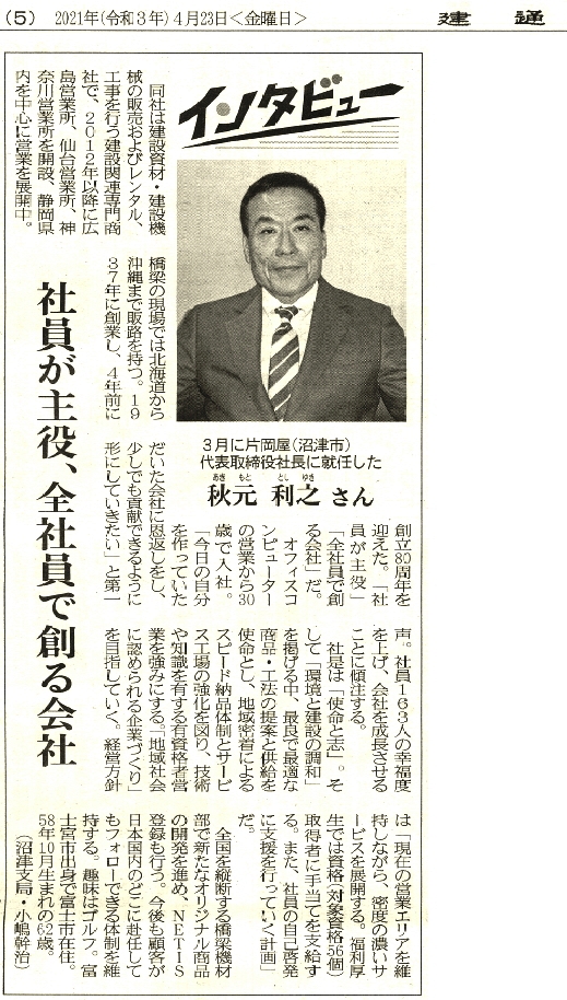 2021年(令和3年)4月23日の建通新聞_静岡版に当社代表秋元のインタビュー記事が掲載されました。